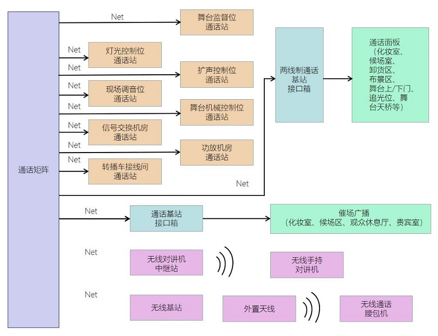 內(nèi)部通話系統(tǒng)簡(jiǎn)稱內(nèi)通系統(tǒng),,一般采用四線和兩線制的有線語(yǔ)音通信系統(tǒng)。舞臺(tái)監(jiān)督控制臺(tái)(安裝內(nèi)通系統(tǒng)主機(jī)和視頻顯示屏)設(shè)在舞臺(tái)區(qū),在化妝室、候場(chǎng)區(qū)及有關(guān)技術(shù)用房?jī)?nèi)設(shè)有內(nèi)通系統(tǒng)墻面或桌面通話站和接入流動(dòng)通信工具的插接座;主要通信工具為便攜式腰包機(jī)、無(wú)線對(duì)講機(jī)、墻面通話站、催場(chǎng)廣播系統(tǒng)。